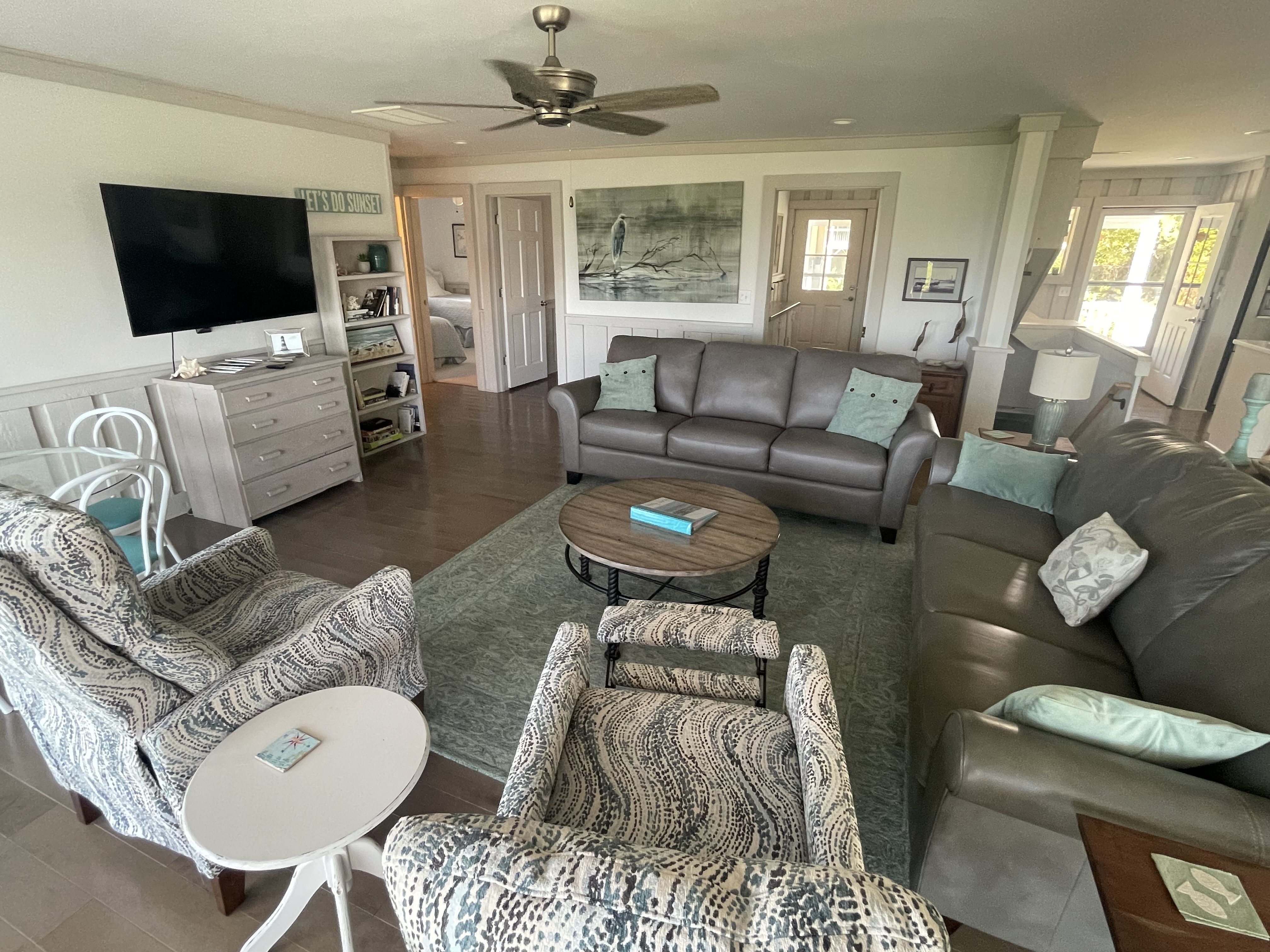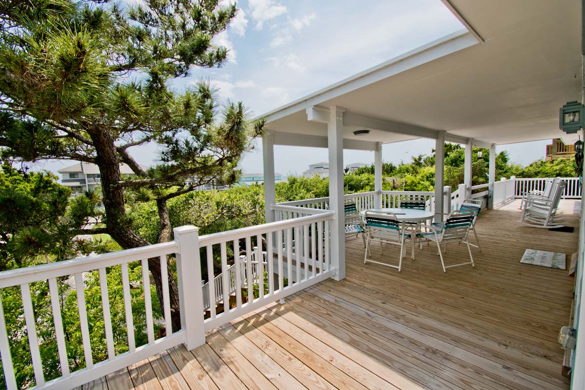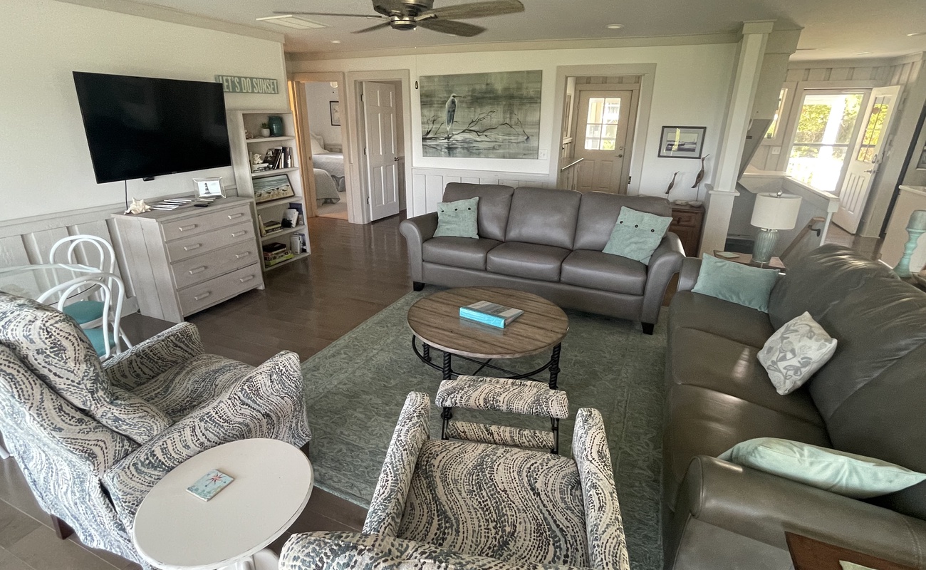 The great room, 3 bedrooms (with TVs) including the master suite, 2 ½ baths, a second TV room and a laundry room are on the main level. There is a partially covered deck for secluded outdoor dining and rockers for relaxing.