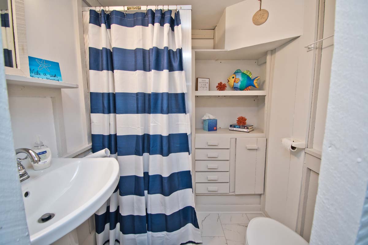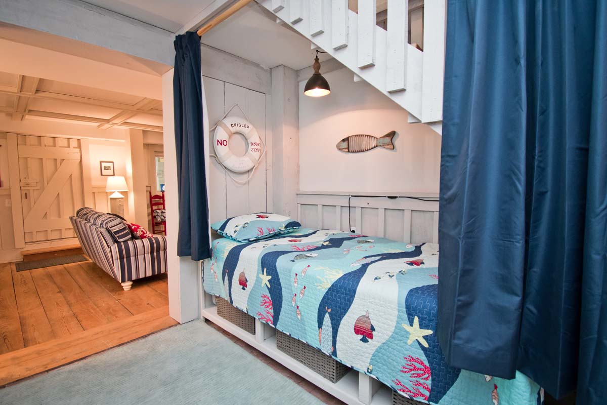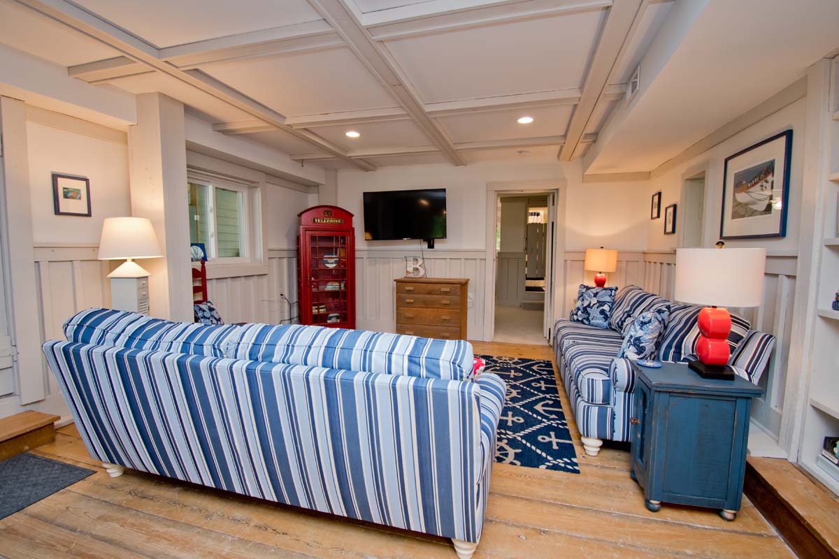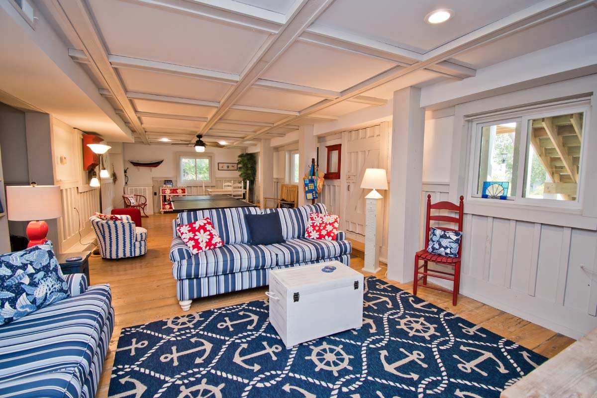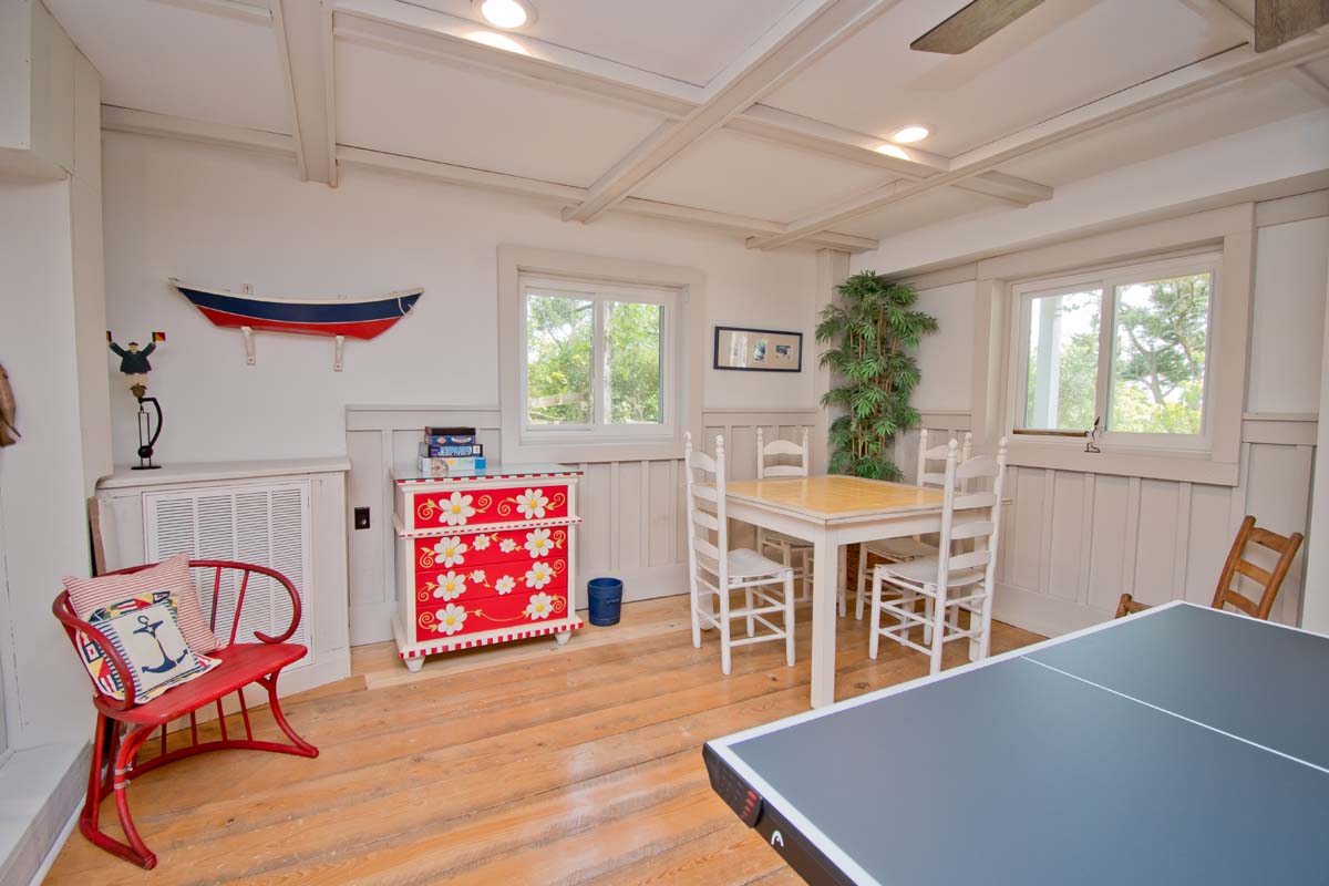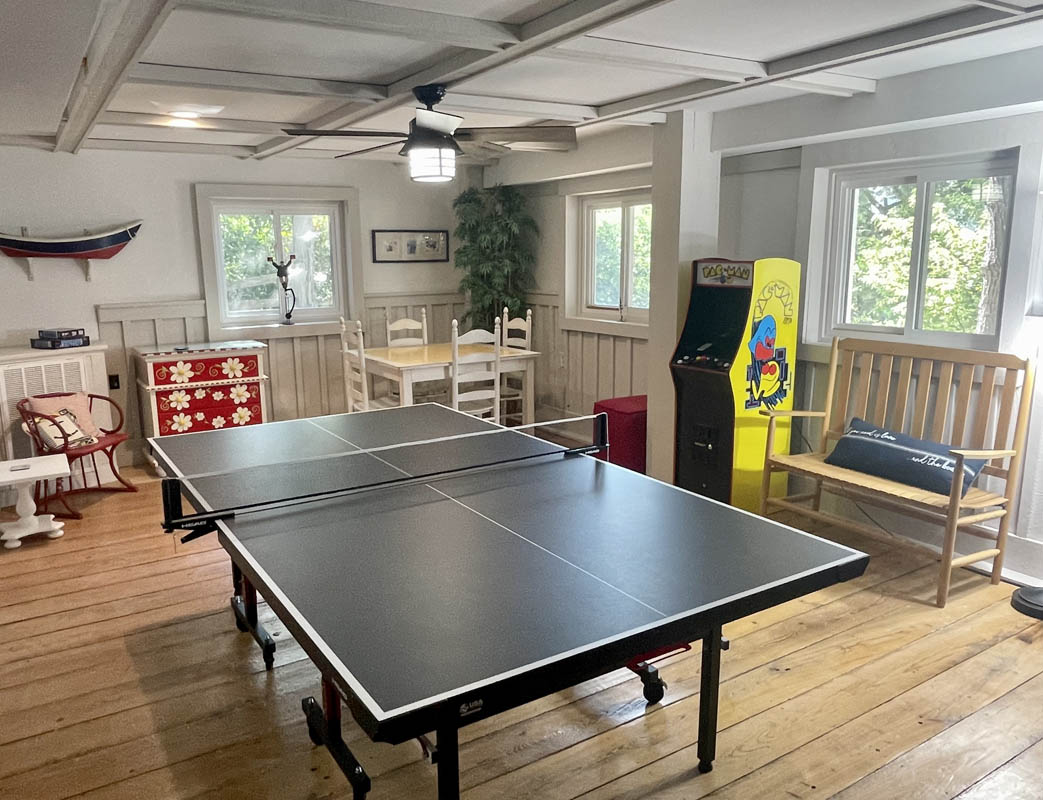 A large rec room with a ping pong table for that competitive side, a Pac Man game, a game table, a sitting area with a TV, a bedroom with bathroom, a second kitchen and a cute twin bed tucked under the stairs. Outside, there is an enclosed oversized hot and cold shower with a changing area.
