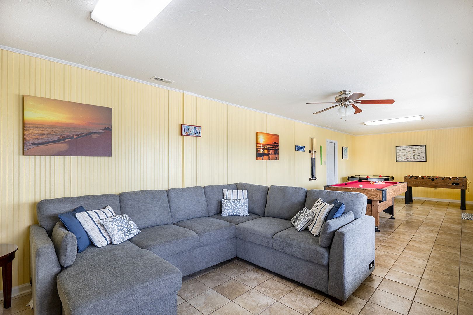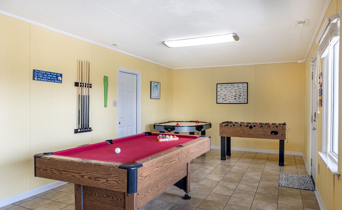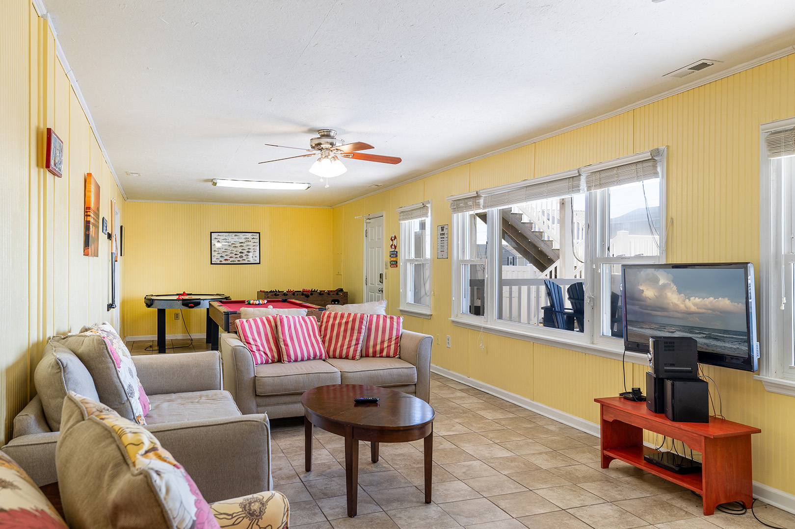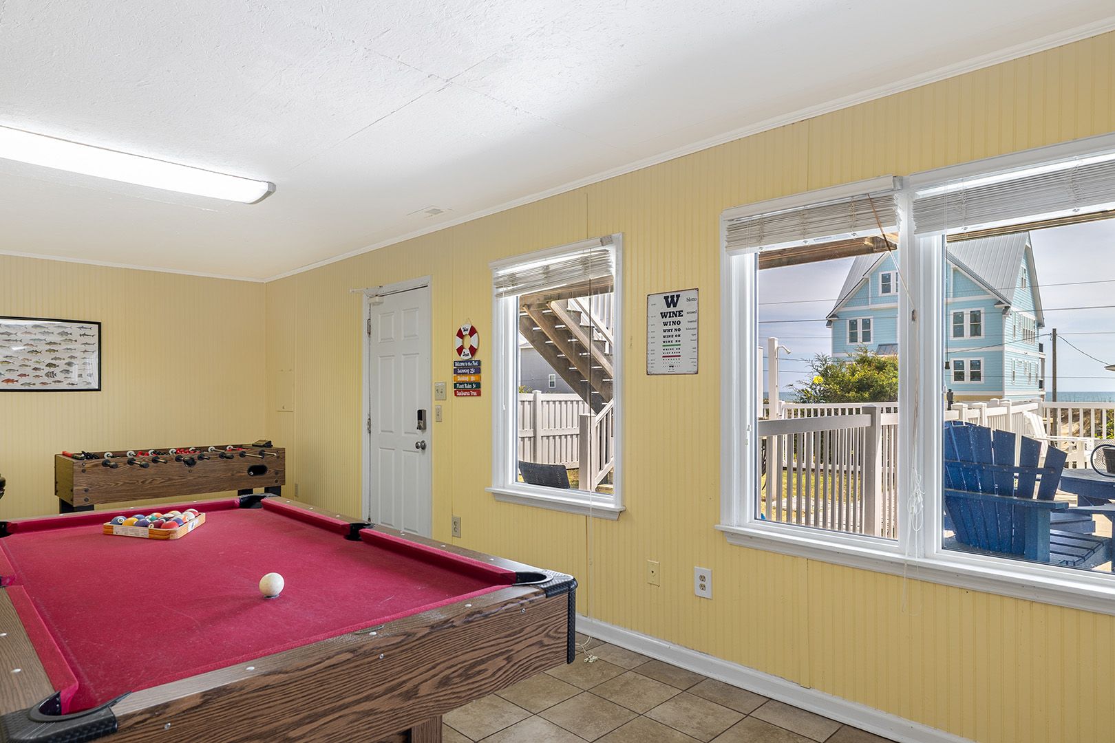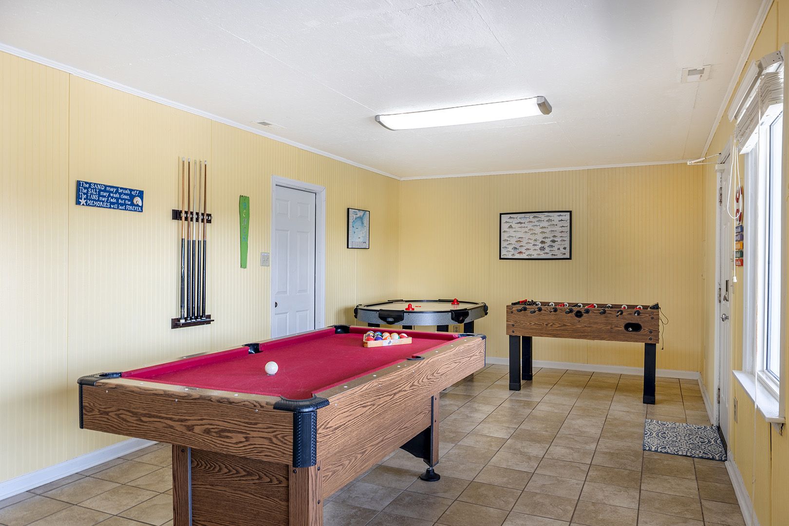 Amenities include: 3 Roku Smart TVs with access to streaming apps, Blu-Ray Player, Wireless High Speed Internet. Hair Dryers, iron/ironing board. Central heat and air, Ceiling fans. Interior Laundry with Washer/Dryer. Fully equipped Kitchen with coffee maker, Keurig coffee maker, refrigerator, oven, microwave, dishwasher, waffle maker, slow cooker, blender. Recreation/Game Room with Pool Table, Ping Pong Table, Air Hockey Table, Foosball Table. Dog Run Area with Waste Bag Dispenser, covered and open deck areas with deck furniture. Charcoal grill. Enclosed outside shower with hot and cold water. Second cold water rinse off with foot wash station. Fish Cleaning Station. Easy beach access right across the street!