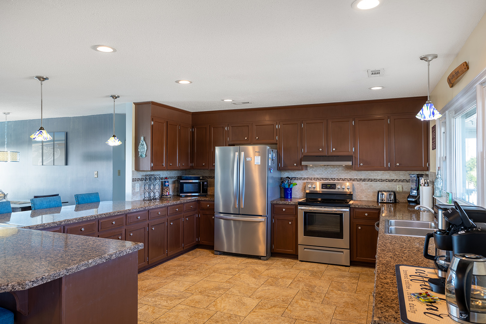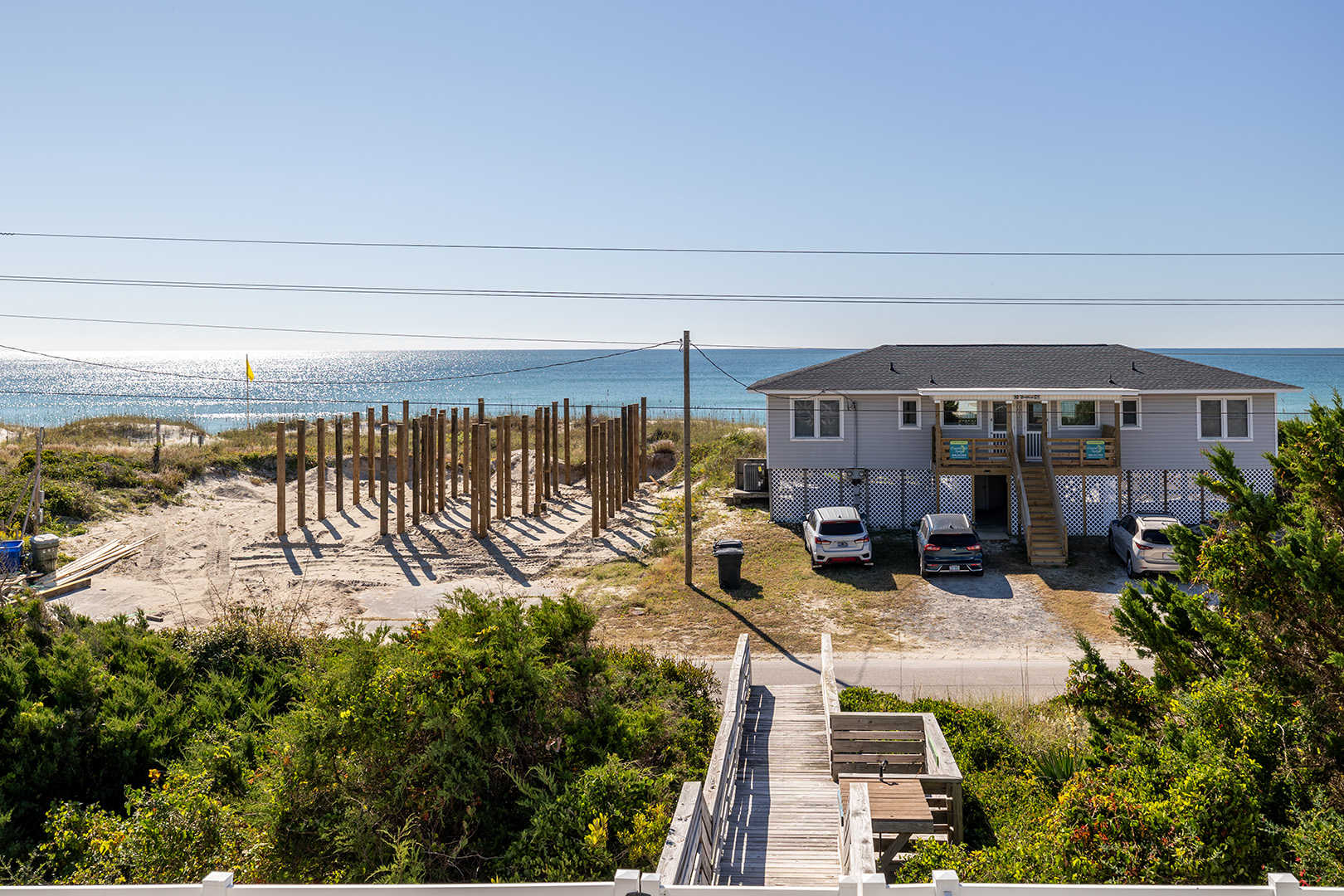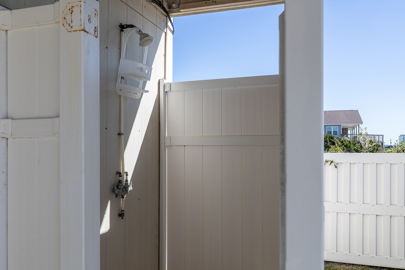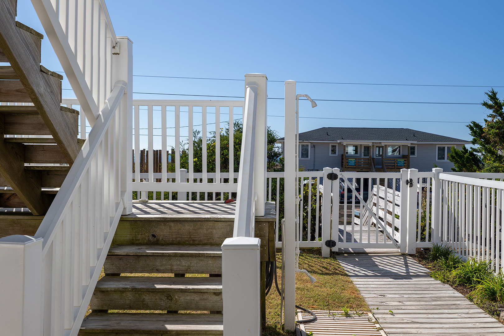 Amenities include: 3 Roku Smart TVs with access to streaming apps, Blu-Ray Player, Wireless High Speed Internet. Hair Dryers, iron/ironing board. Central heat and air, Ceiling fans. Interior Laundry with Washer/Dryer. Fully equipped Kitchen with coffee maker, Keurig coffee maker, refrigerator, oven, microwave, dishwasher, waffle maker, slow cooker, blender. Recreation/Game Room with Pool Table, Ping Pong Table, Air Hockey Table, Foosball Table. Dog Run Area with Waste Bag Dispenser, covered and open deck areas with deck furniture. Charcoal grill. Enclosed outside shower with hot and cold water. Second cold water rinse off with foot wash station. Fish Cleaning Station. Easy beach access right across the street!