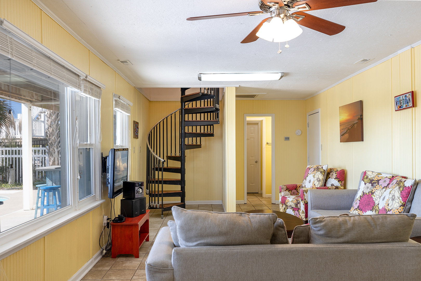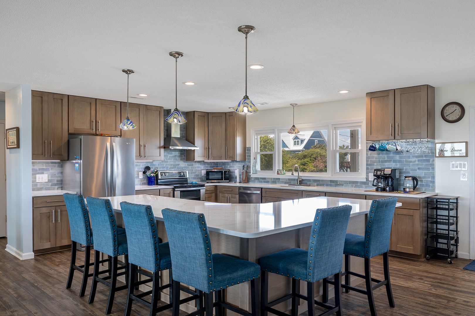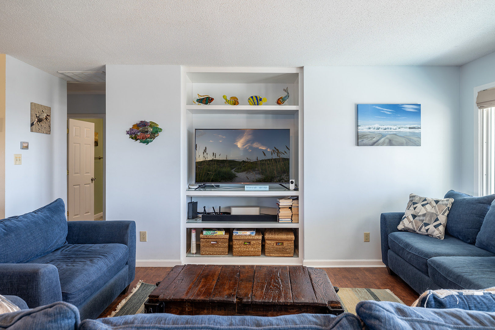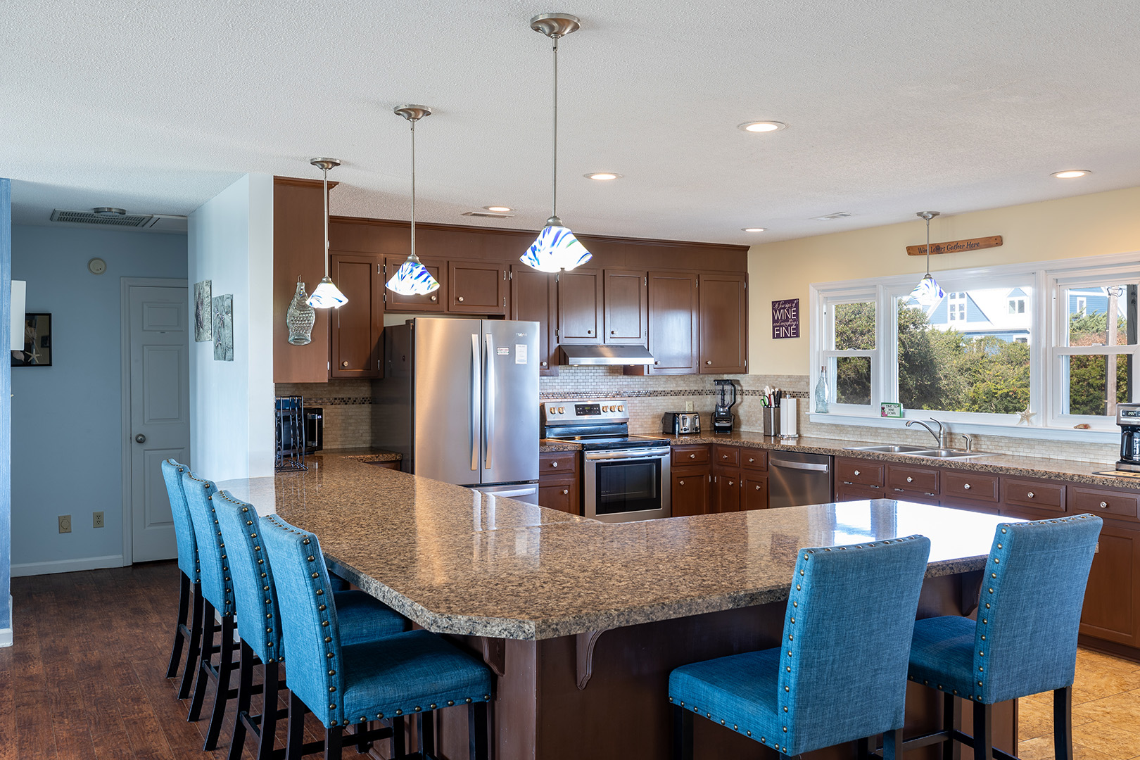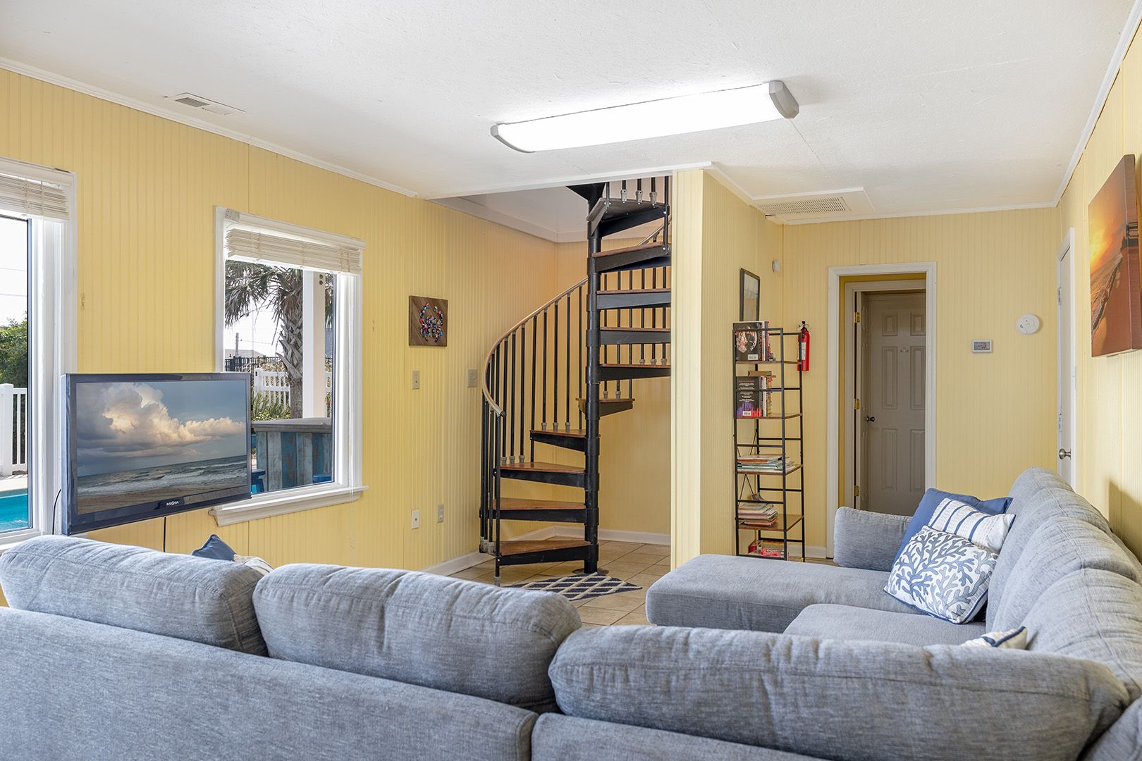 Amenities include: 3 Roku Smart TVs with access to streaming apps, Blu-Ray Player, Wireless High Speed Internet. Hair Dryers, iron/ironing board. Central heat and air, Ceiling fans. Interior Laundry with Washer/Dryer. Fully equipped Kitchen with coffee maker, Keurig coffee maker, refrigerator, oven, microwave, dishwasher, waffle maker, slow cooker, blender. Recreation/Game Room with Pool Table, Ping Pong Table, Air Hockey Table, Foosball Table. Dog Run Area with Waste Bag Dispenser, covered and open deck areas with deck furniture. Charcoal grill. Enclosed outside shower with hot and cold water. Second cold water rinse off with foot wash station. Fish Cleaning Station. Easy beach access right across the street!