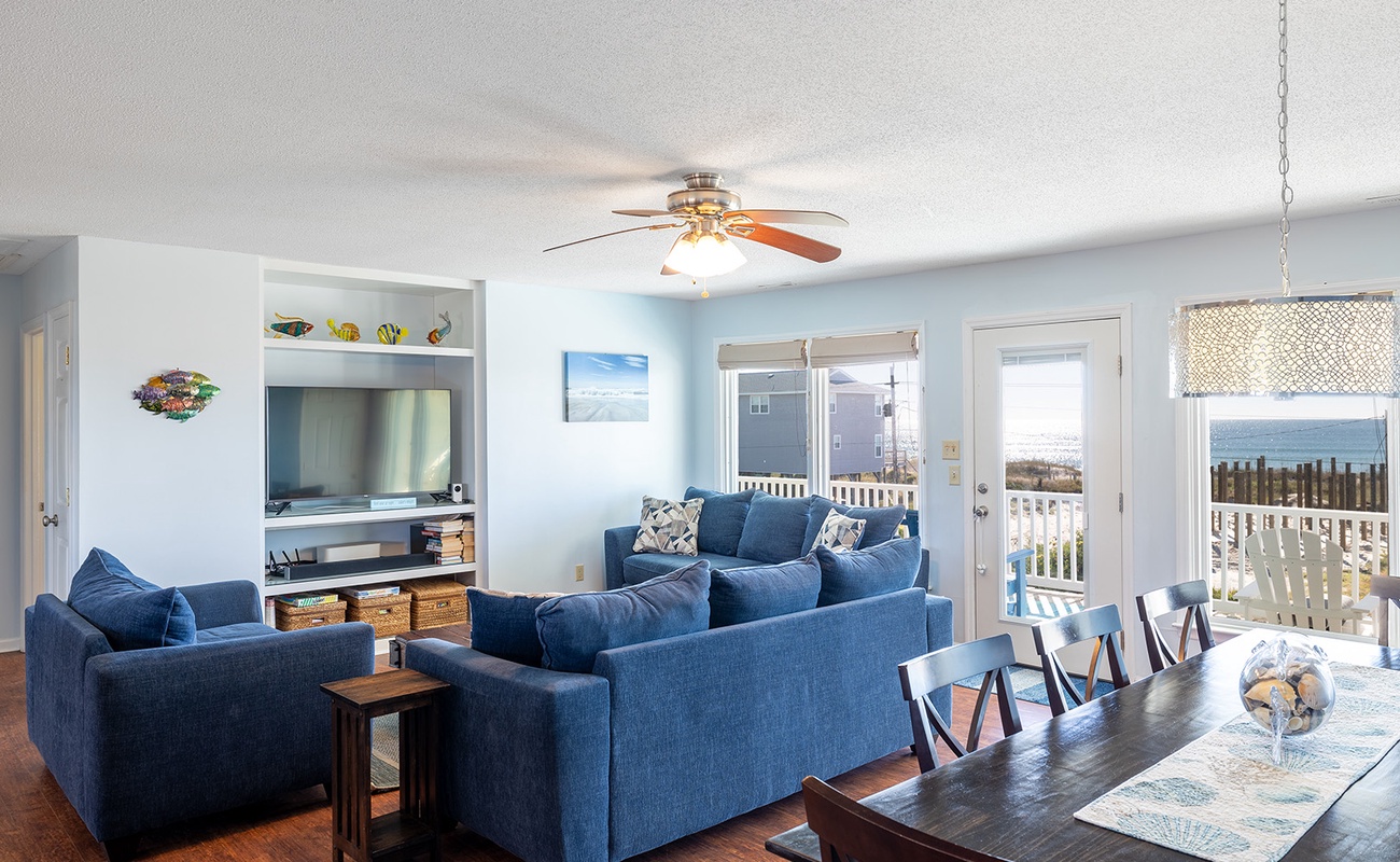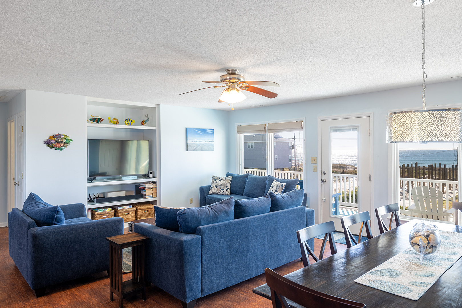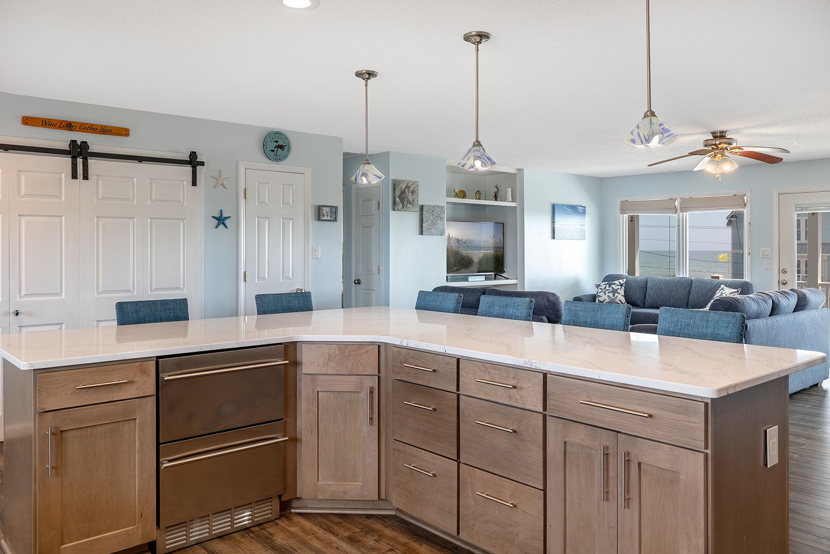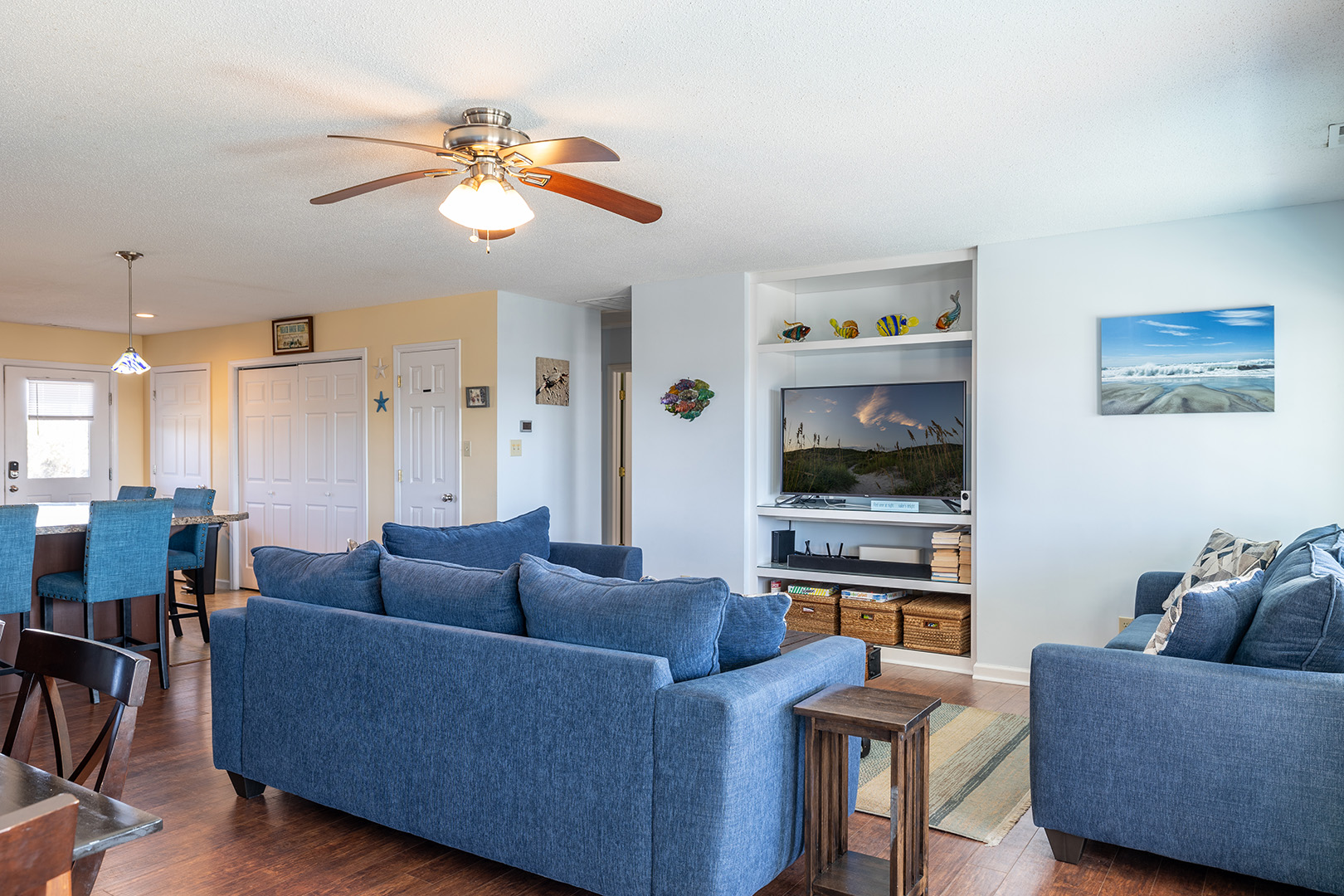 Amenities include: 3 Roku Smart TVs with access to streaming apps, Blu-Ray Player, Wireless High Speed Internet. Hair Dryers, iron/ironing board. Central heat and air, Ceiling fans. Interior Laundry with Washer/Dryer. Fully equipped Kitchen with coffee maker, Keurig coffee maker, refrigerator, oven, microwave, dishwasher, waffle maker, slow cooker, blender. Recreation/Game Room with Pool Table, Ping Pong Table, Air Hockey Table, Foosball Table. Dog Run Area with Waste Bag Dispenser, covered and open deck areas with deck furniture. Charcoal grill. Enclosed outside shower with hot and cold water. Second cold water rinse off with foot wash station. Fish Cleaning Station. Easy beach access right across the street!