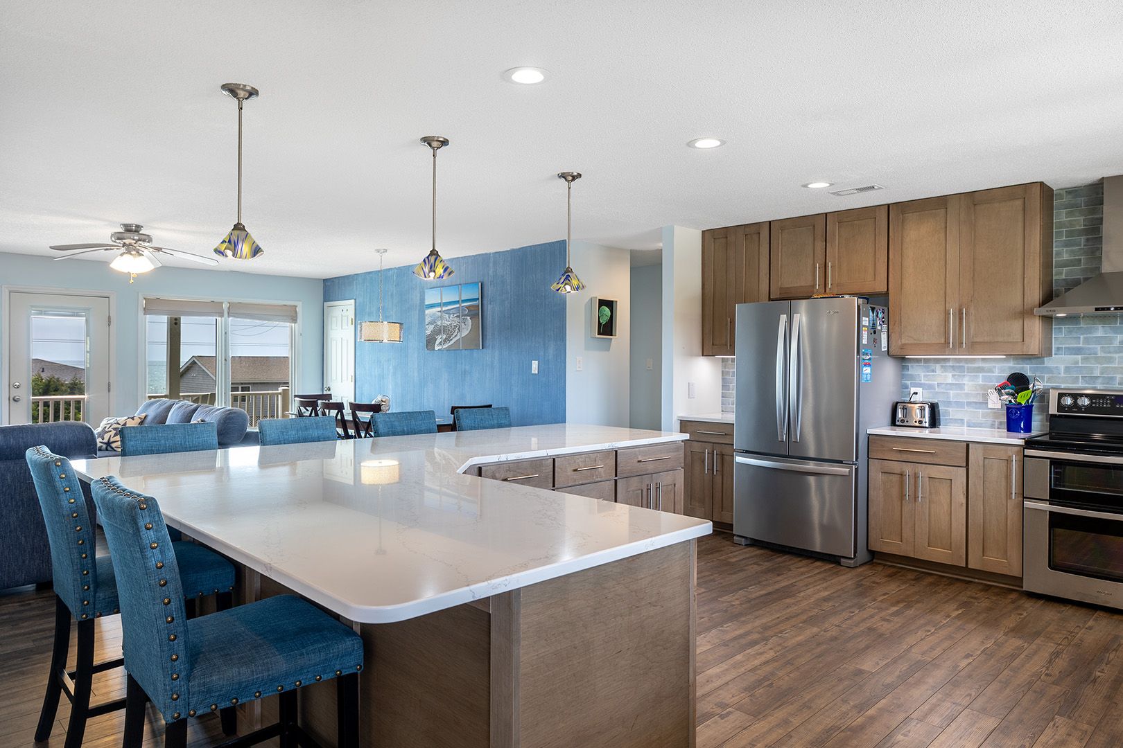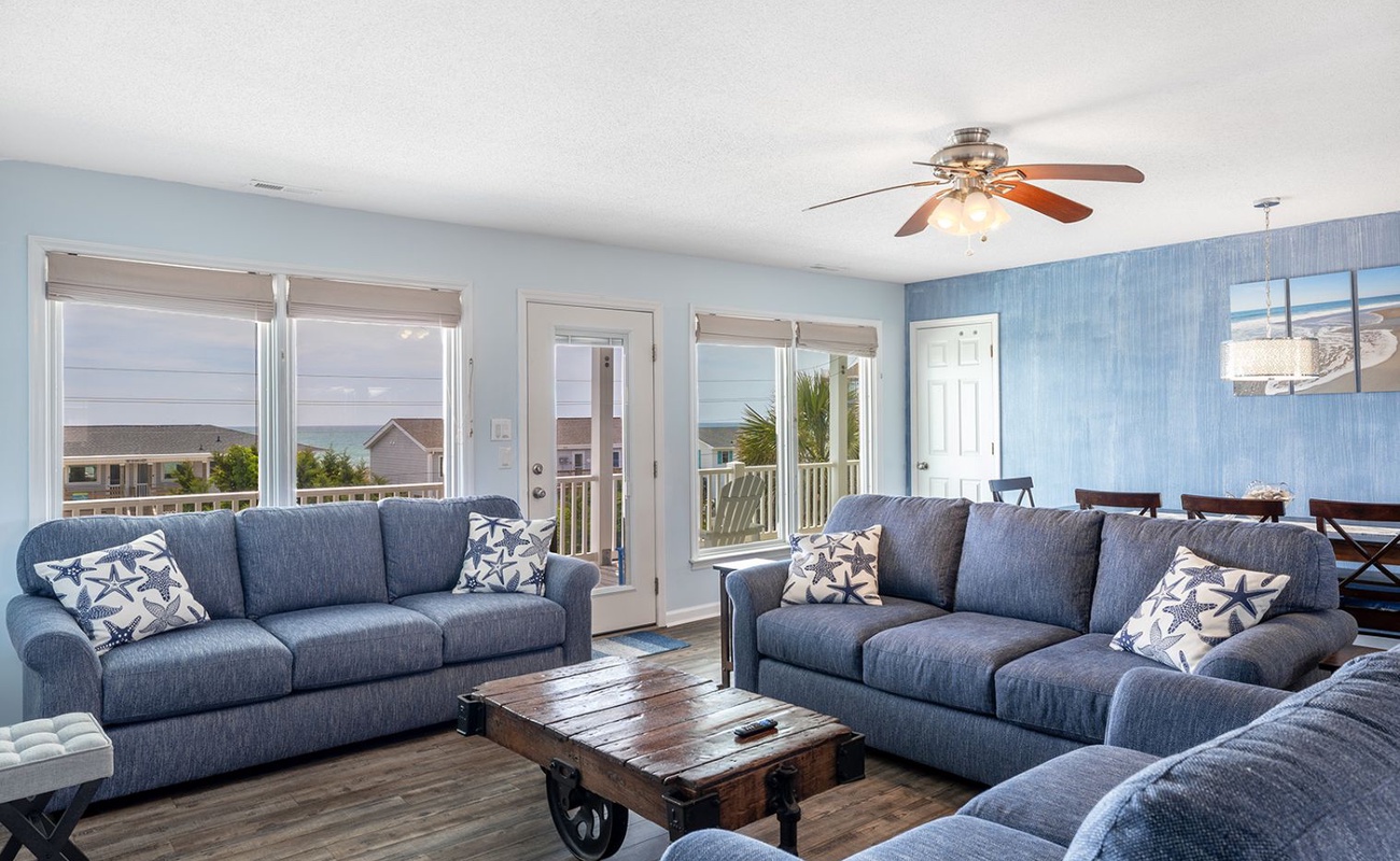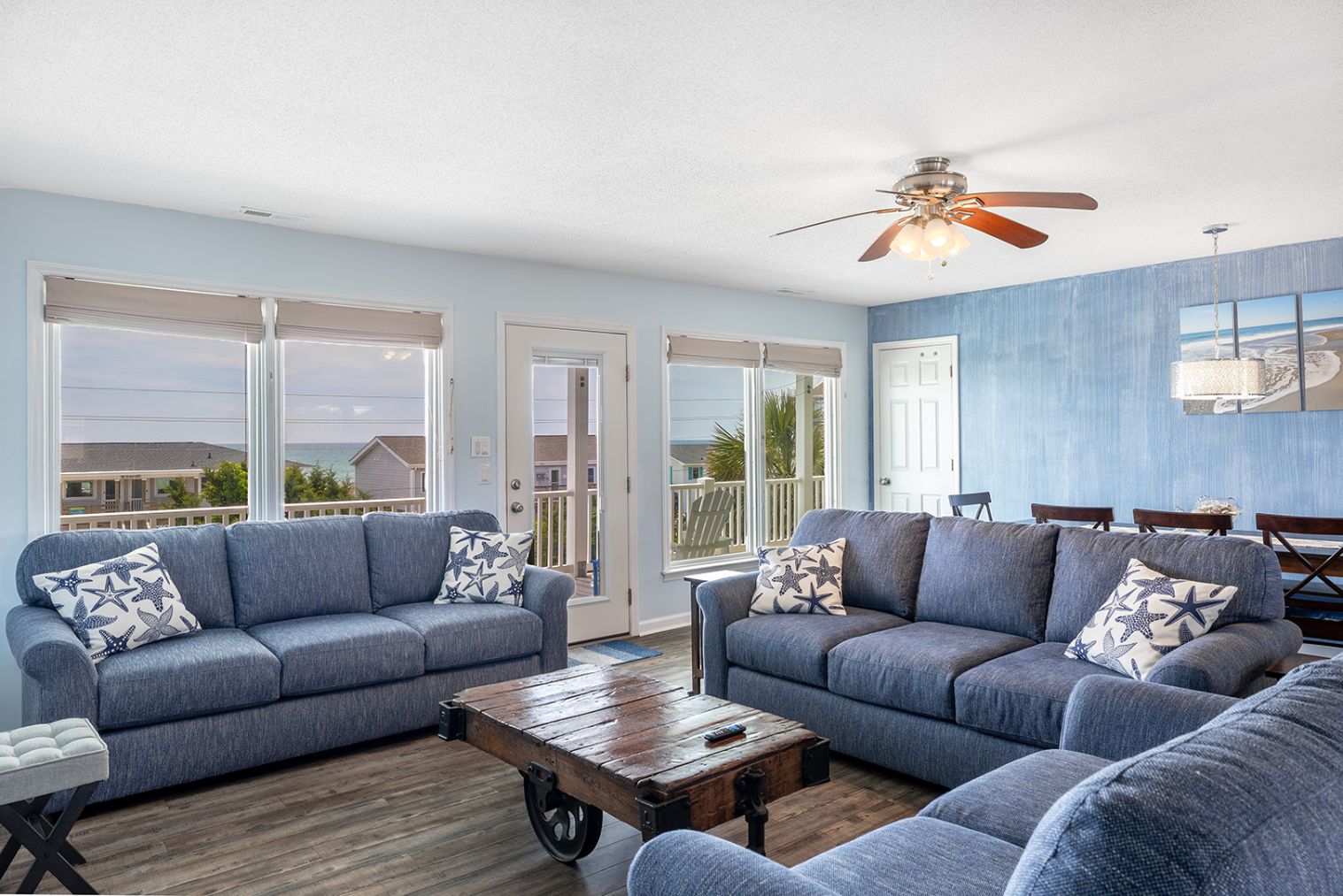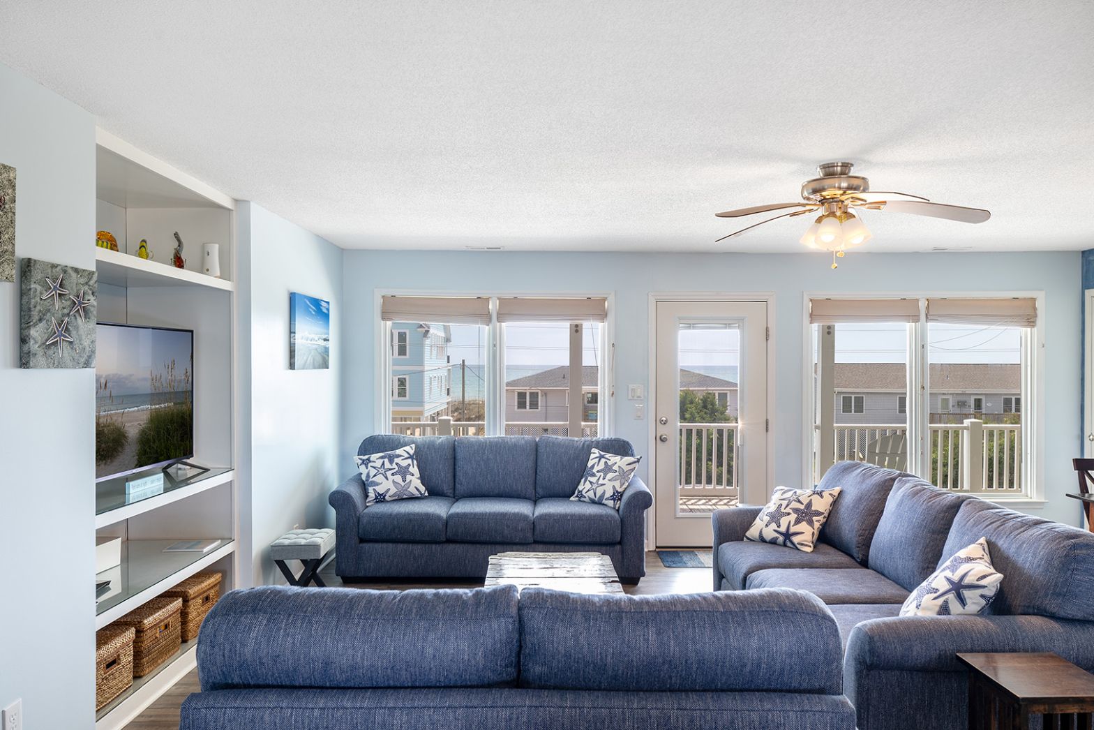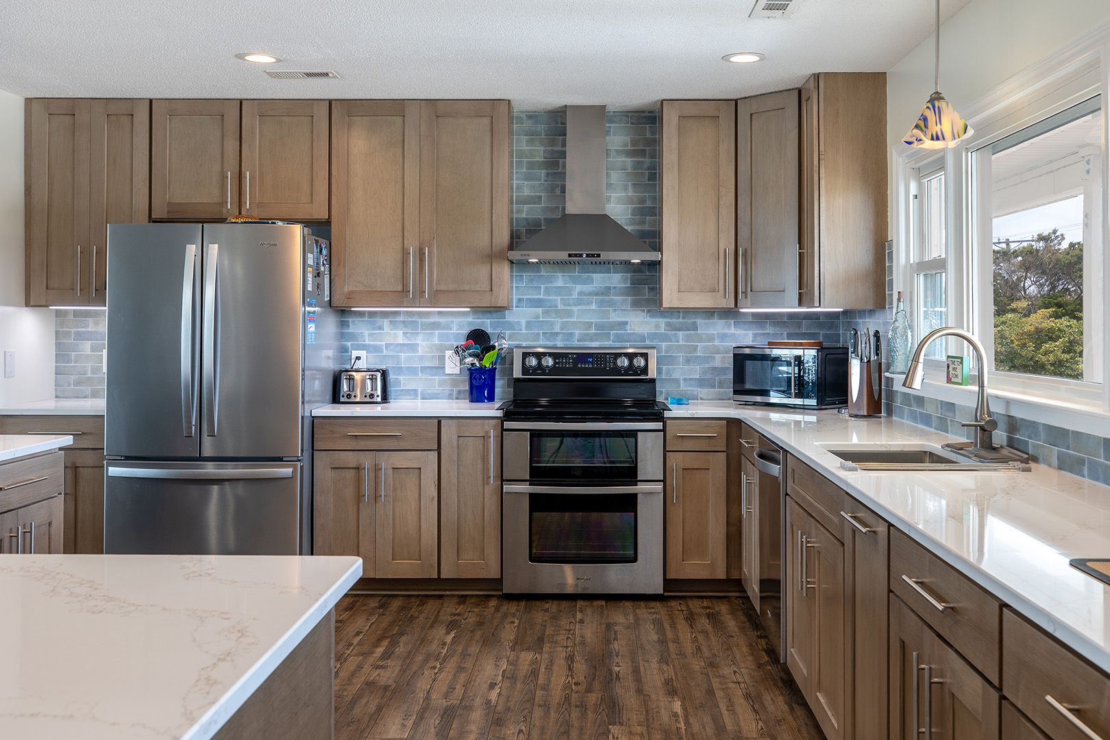 Amenities include: 3 Roku Smart TVs with access to streaming apps, Blu-Ray Player, Wireless High Speed Internet. Hair Dryers, iron/ironing board. Central heat and air, Ceiling fans. Interior Laundry with Washer/Dryer. Fully equipped Kitchen with coffee maker, Keurig coffee maker, refrigerator, oven, microwave, dishwasher, waffle maker, slow cooker, blender. Recreation/Game Room with Pool Table, Ping Pong Table, Air Hockey Table, Foosball Table. Dog Run Area with Waste Bag Dispenser, covered and open deck areas with deck furniture. Charcoal grill. Enclosed outside shower with hot and cold water. Second cold water rinse off with foot wash station. Fish Cleaning Station. Easy beach access right across the street!