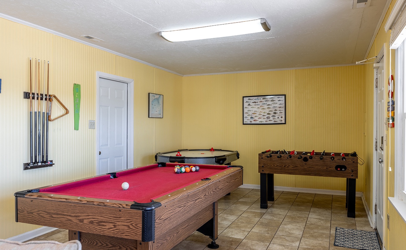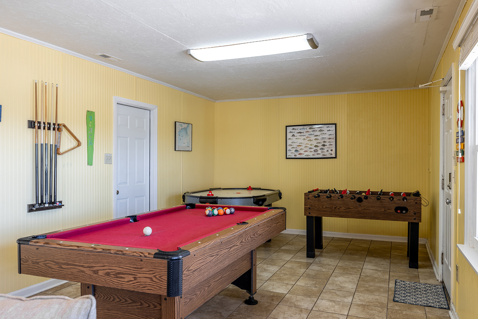 Lower Level: Game room with Pool Table, Air Hockey, Foosball Table, Access to Extrior. Half Bath. Bonus Room with Queen Bed and 1 Set of Twin Bunk Beds. Two car garage with Ping Pong Table.
